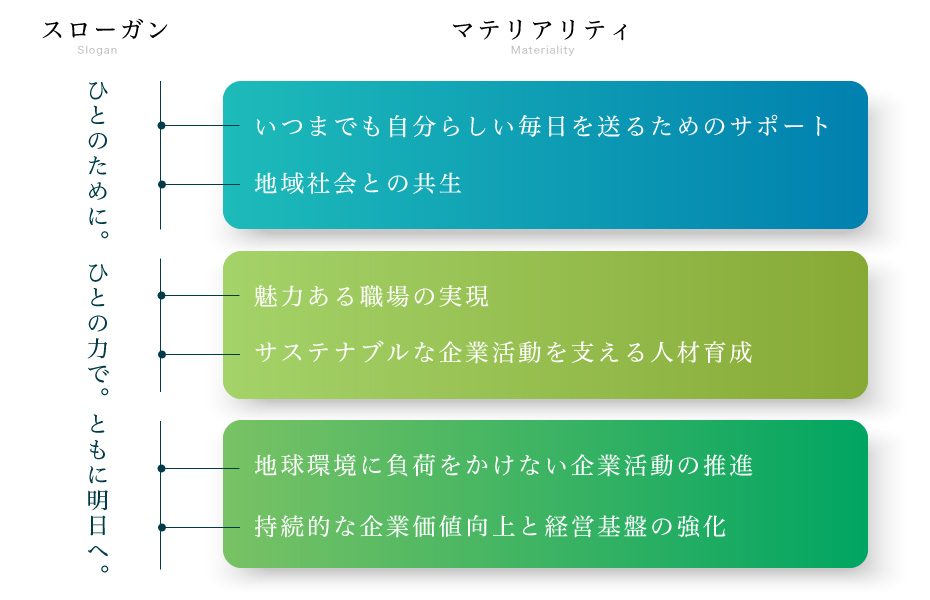 少子高齢化やライフスタイルの多様化によって増え続ける社会課題を解決するためのサービスを提供し、持続可能な高成長を実現するため、この企業スローガンを基にした具体的な取り組み(マテリアリティ)の検討を進め、以下のマテリアリティを決定しました。