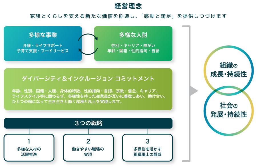 多様な人々が多様な事業において経営理念を実践することによって、組織と社会の持続的成長に貢献します