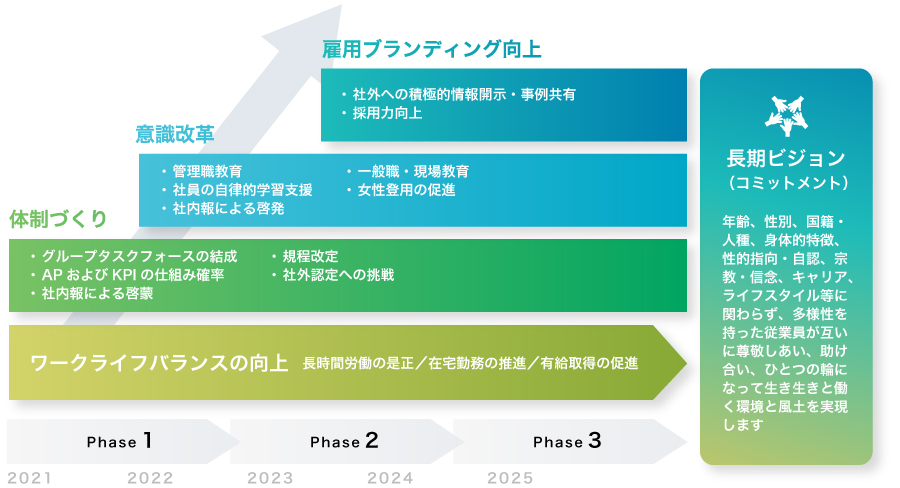多様な事業を通して、人によるサービスを提供する会社だからこそ、さまざまな属性や特性を持つ従業員一人ひとりが最大限にその能力を発揮し、活き活きとやりがいを感じて働ける会社となることが不可欠です。